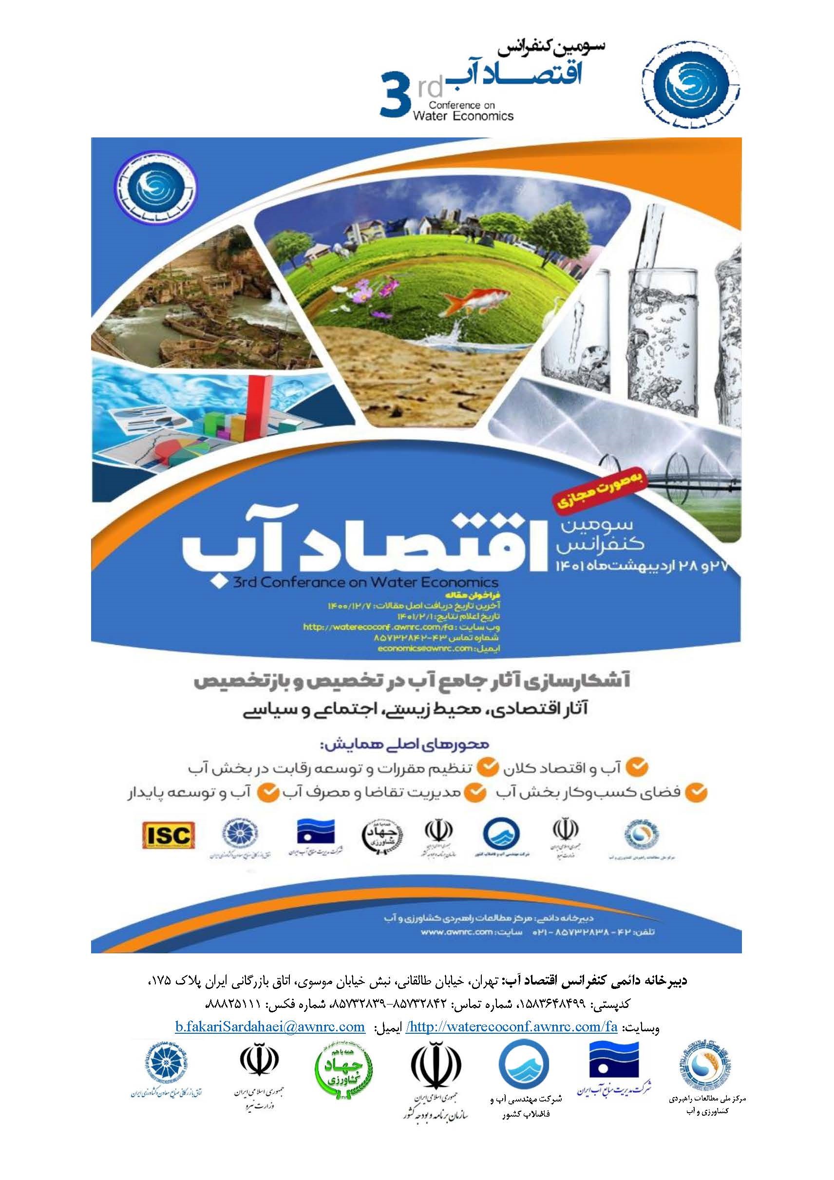 سومین کنفرانس دوسالانه اقتصاد آب در تاریخ 27 و 28 اردیبهشت سال 1401 برگزار خواهد شد. شعار این دوره: «آشکارسازی آثار جامع آب در تخصیص و بازتخصیص-آثار اقتصادی، محیط زیستی، اجتماعی و سیاسی» بوده و کنفرانس ذیل 5 محور اصلی «آب و اقتصاد کلان، تنظیم مقررات و توسعه رقابت در بخش آب، فضای کسب و کار بخش آب، مدیریت تقاضا و مصرف آب و آب و توسعه پایدار» مقاله دریافت خواهد نمود. این کنفرانس با همکاری و مشارکت مرکز ملی مطالعات راهبردی کشاورزی و آب به نیابت از طرف اتاق بازرگانی، صنایع، معادن و کشاورزی ایران، شرکت مادر تخصصی مدیریت منابع آب ایران و شرکت مادر تخصصی مهندسی آب و فاضلاب کشور از وزارت نیرو، معاونت آب و خاک از وزارت جهاد کشاورزی و سازمان برنامه و بودجه کشور برگزار خواهد شد. از کلیه پژوهشگران و کارشناسان در دانشگاهها، مراکز پژوهشي و صنعتي دعوت مي شود تا در این کنفرانس شرکت نمایند.